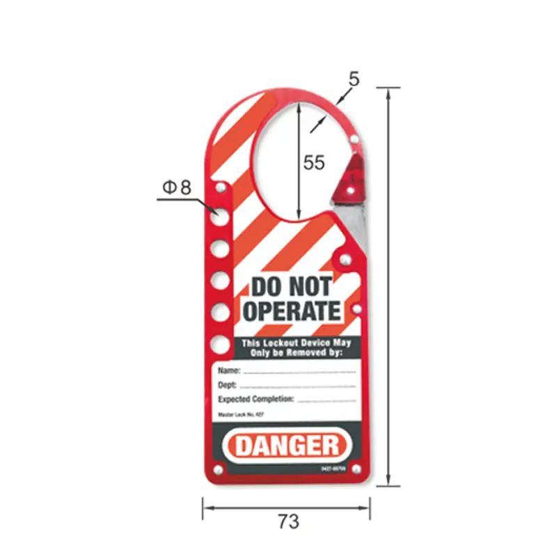 Łączy zalety tabliczek ostrzegawczych i zaczepów bezpieczeństwa w jednym wygodnym produkcie. Wykonany z anodyzowanego aluminium i stali nierdzewnej zapewnia odporność korozyjną i wytrzymałość. Sprężynowe ramię blokujące oferuje łatwą aplikację dzięki systemowi „snap-on”. Wymiary: 73mm x 178mm, światło wewnętrzne szczęk: 44mm x 54mm, pomieści do 5 kłódek bezpieczeństwa. Trwałe etykiety z przodu i tyłu z miejscem do zapisu akceptującym długopis, ołówek i marker permanentny. Napisy: przednia strona „DANGER DO NOT OPERATE”, tylna „DANGER only individuals who signed below may remove this lock/tag”. Pasuje do większej liczby punktów blokowania niż alternatywne zaczeepy z zawiasem nitowanym.