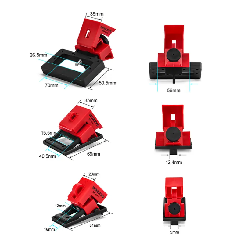 Seria blokad zaciskowych BOZZYS to profesjonalne rozwiązania zabezpieczające dla wyłączników automatycznych każdej wielkości. Dostępne w trzech rozmiarach: BD-D11 (do 16 mm), BD-D12 (do 38 mm) i BD-D13 (do 68 mm) – dopasowane do małych, średnich i dużych wyłączników. Wykonane z wytrzymałego polipropylenu PP i wzmocnionego nylonu PA66 z 20% włóknem szklanym. Innowacyjny system mocowania ze śrubą motylkową i pokrywą zabezpieczającą. Odpinane uchwyty rozszerzają zakres zastosowań. Instalacja bez narzędzi. Kompatybilne z kłódkami o kabłąku do 7 mm. Odporność na temperatury od -50°C do +177°C. Idealne dla procedur LOTO w każdej instalacji elektrycznej.