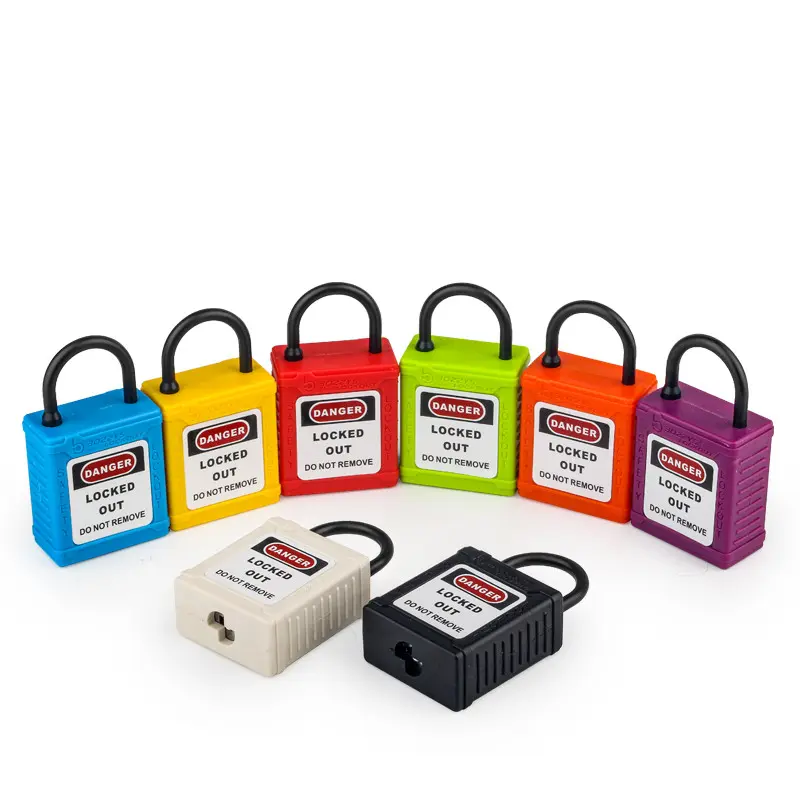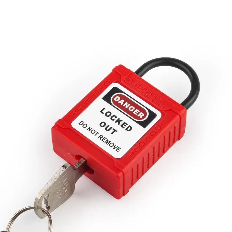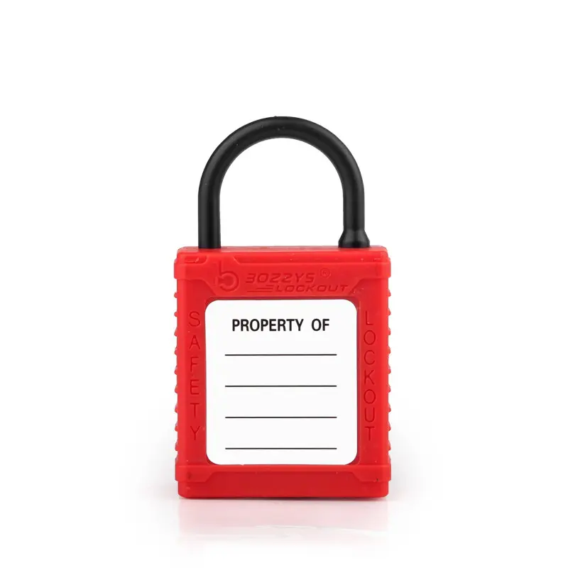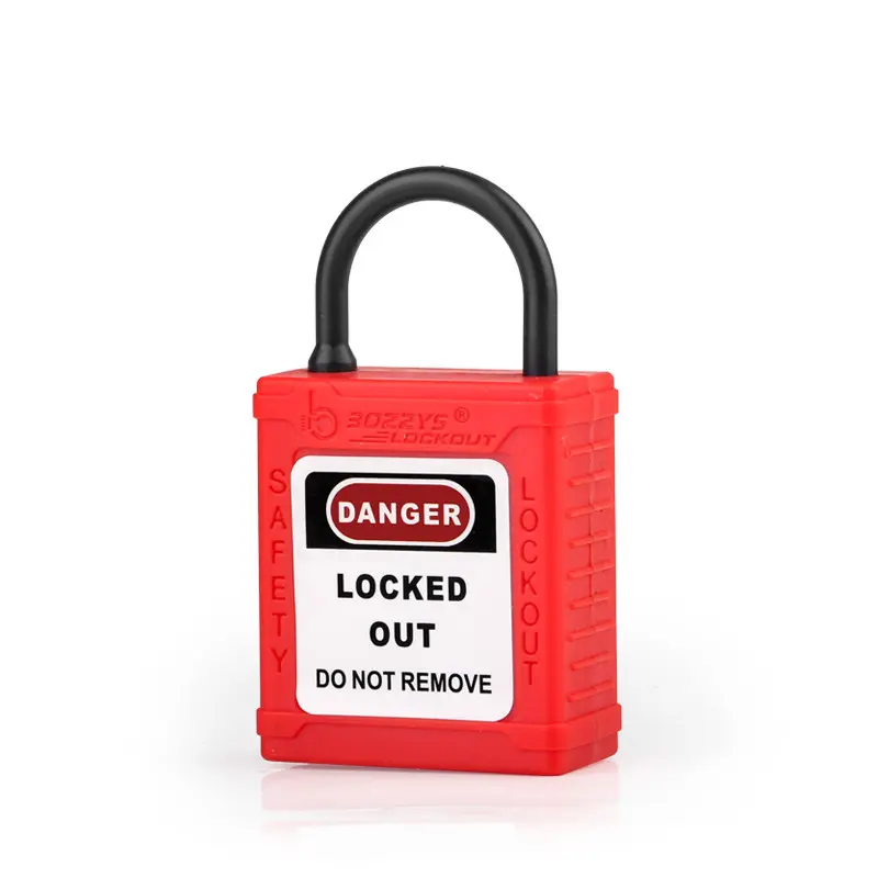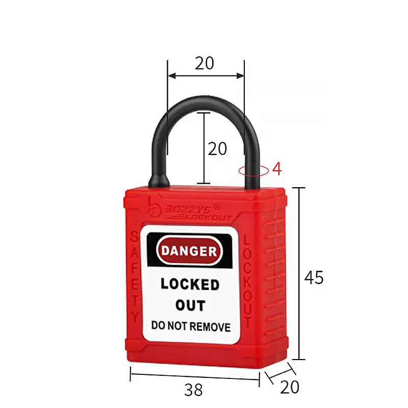 Kłódki z blokadą i oznakowaniem mają nylonowe kabłąki (Ø4 mm, H20 mm), które są odpowiednie do przemysłowego stosowania w obszarach przewodzących, zapobiegając przypadkowemu uruchomieniu.