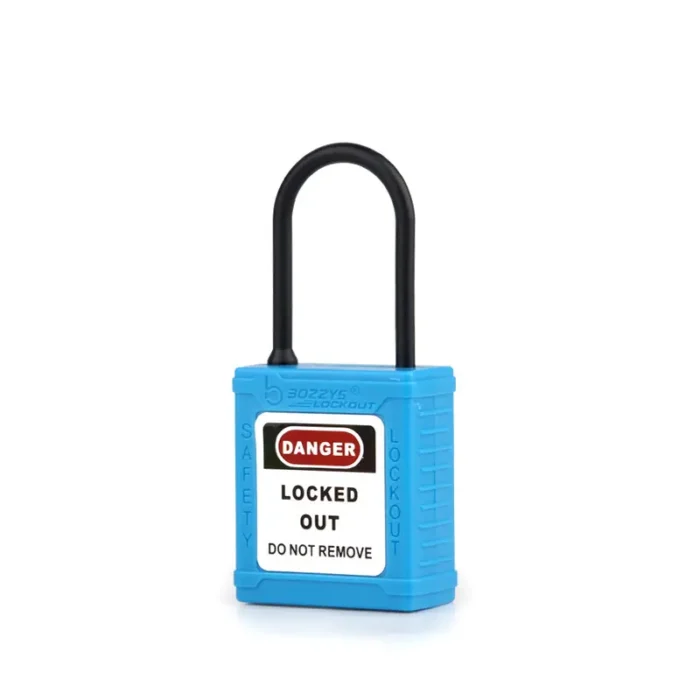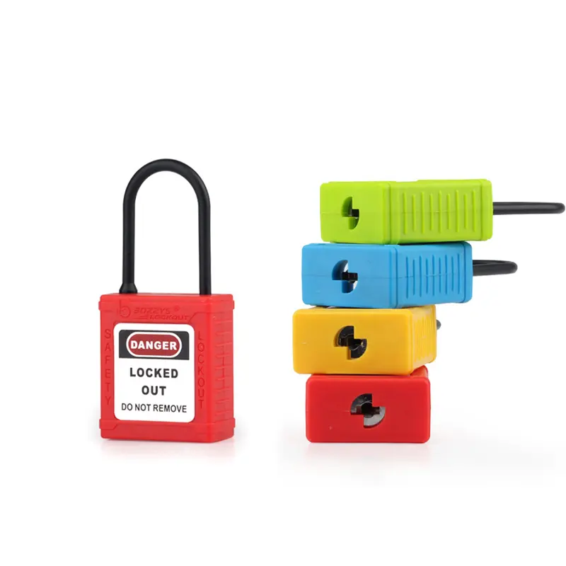 Kłódki z blokadą i oznakowaniem mają nylonowe kabłąki (Ø4 mm, H38 mm), które są odpowiednie do przemysłowego stosowania w obszarach przewodzących, zapobiegając przypadkowemu uruchomieniu.