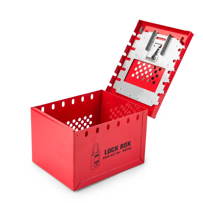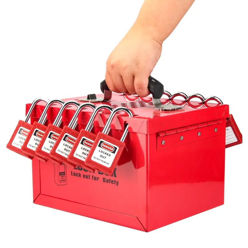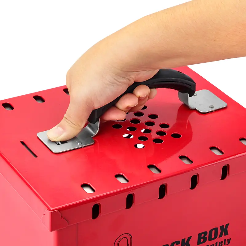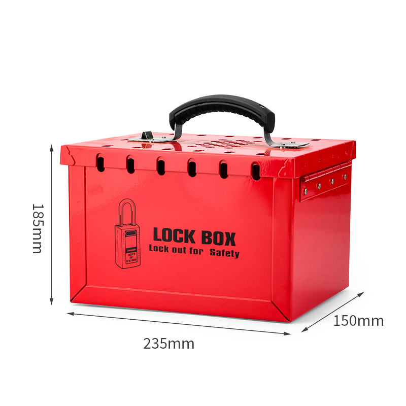 Skrzynka LOTO XL grupowej blokady BD-X04 to przenośna skrzynka LOTO, która umożliwia bezpieczne przechowywanie kluczy od zablokowanych urządzeń. Pomieści do 12 kłódek jednocześnie, a dostęp do kluczy będzie możliwy dopiero po zdjęciu wszystkich kłódek — co zapewnia skuteczne zabezpieczenie przy pracach zespołowych. Stalowa konstrukcja z malowaniem proszkowym oferuje odporność na korozję i warunki przemysłowe, a wygodny uchwyt umożliwia łatwe przenoszenie.